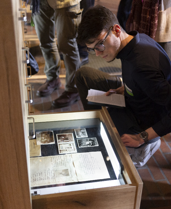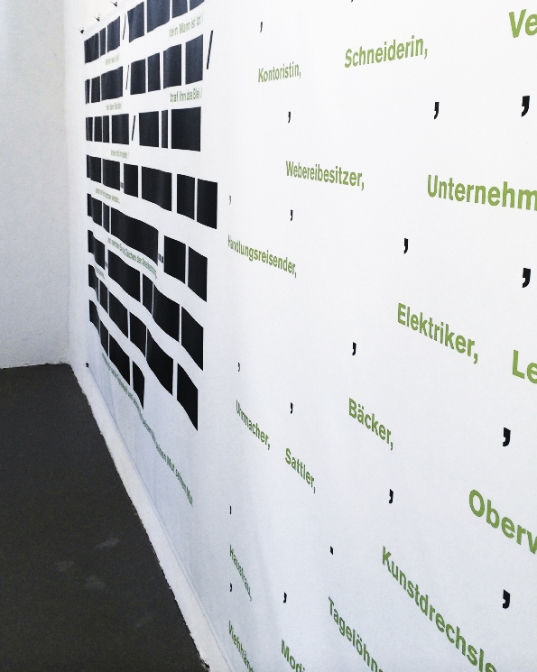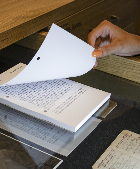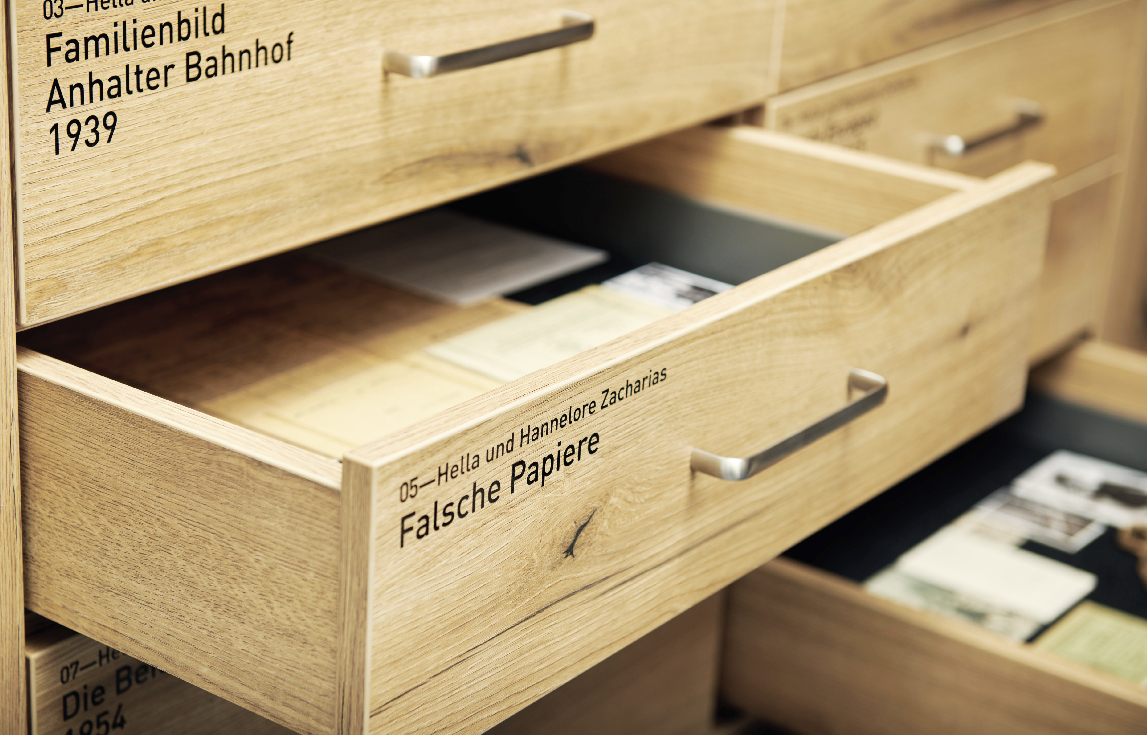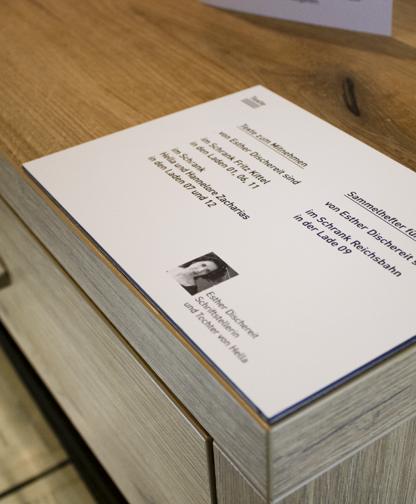 an introduction to the topic with a timeline biographical documents, ten documentary films, literary take away texts by the writer esther dischereit, three rolling boxes with drawers containing documents and explanatory texts: they invite visitors to browse and discover.